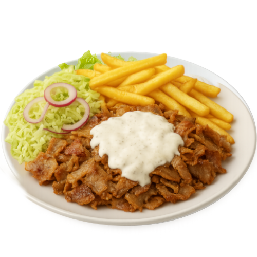 Saftiges, frisch vom Spieß geschnittenes Dönerfleisch, serviert mit knusprigen Pommes frites und einem knackigen, bunt gemischten Salat.